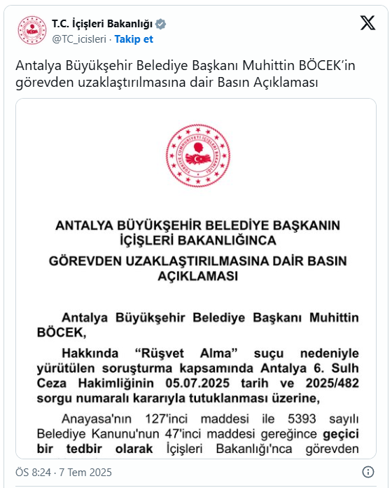 İçişleri Bakanlığı yaptığı resmî açıklamada; “ Antalya Büyükşehir Belediye Başkanı Muhittin Böcek, hakkında ‘rüşvet alma’ suçu nedeniyle yürütülen soruşturma kapsamında Antalya 6, Sulh Ceza Hakimliğinin 05.07.2025 tarih ve 2025/482 sorgu numaralı kararıyla tutuklanması üzerine,