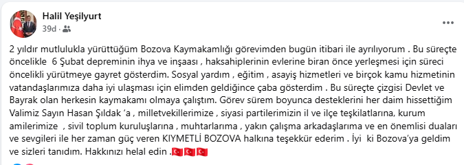 “2 yıldır mutlulukla yürüttüğüm Bozova Kaymakamlığı görevimden bugün itibari ile ayrılıyorum. Bu süreçte öncelikle 6 Şubat depreminin ihya ve inşası, hak sahiplerinin evlerine bir an önce yerleşmesi için süreci öncelikli yürütmeye gayret gösterdim. Sosyal yardım, eğitim, asayiş hizmetleri ve birçok kamu hizmetinin vatandaşlarımıza daha iyi ulaşması için elimden geldiğince çaba gösterdim. Bu süreçte çizgisi Devlet ve Bayrak olan herkesin kaymakamı olmaya çalıştım.”